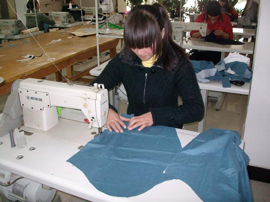五、工作服的縫制:在針距密度中規定明線(包括不見明線的暗線)的針距,每3cm 14—18針。面料的品種很多,為保證產品的外觀和牢固,不同的面料應選不同的針距。如硬質面料的針距可以稀一點,質地松軟的面料針距可以密一點。縫制部位的線路不準隨便彎曲,要符合工作服的造型的需要;線路要整齊,不重疊,無跳針、拋線,針跡清晰好看,縫制的起止回針要牢固,搭頭線的長度要適宜,無漏針、脫線現象,縫線松緊要與面料厚薄、質地相適應。