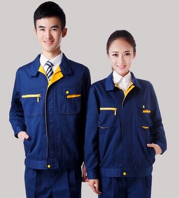 JL-QD249東莞工作服 以深藍色為主色,胸前采用黃色搭配,醒目,工業感強。前兜撞色拼接,走線細致,實用性強。左中腰間口袋均采用雙層設計,傾斜線條,穩重大氣